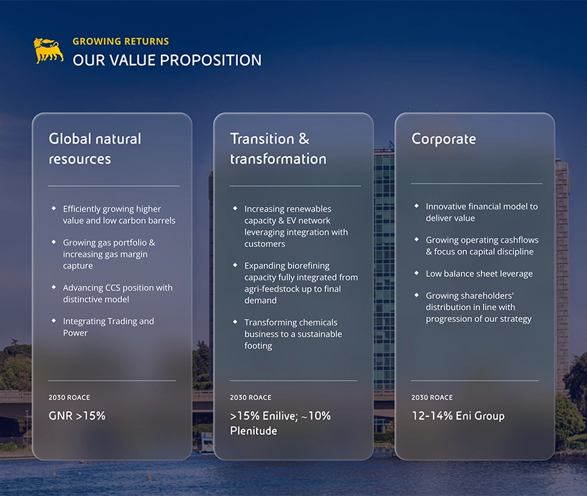 - Driving continued momentum in our satellite model: Azule, Var, Enilive, Plenitude, now Ithaca and soon CCUS and Indonesia.